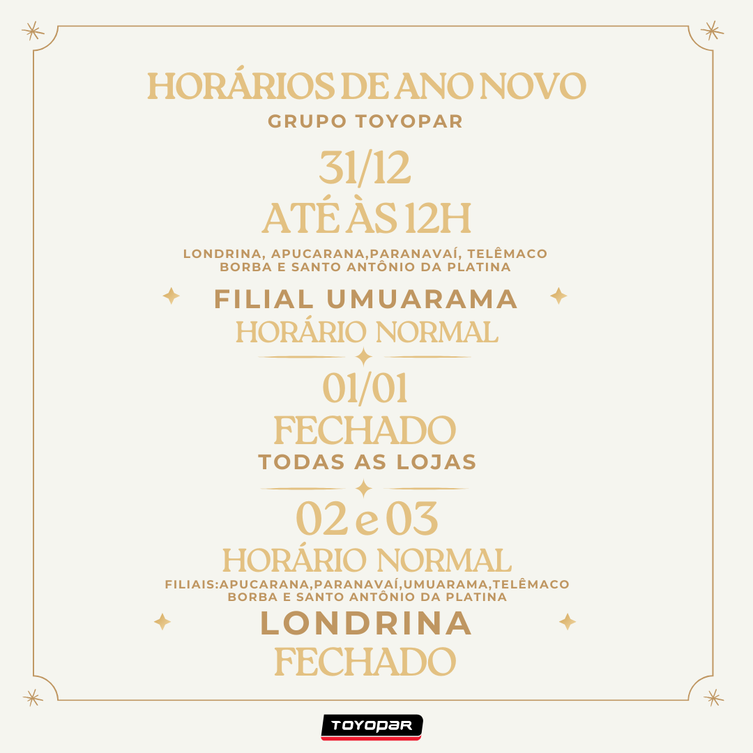 Para os veículos Toyota a partir do ano/modelo 2020/2020 (exceto Hilux e SW4 a partir do ano/modelo 2024/2025), nossos clientes contam com cinco anos de garantia básica, contados a partir da entrega do veículo 0 km ao primeiro proprietário. A cobertura é válida sem limite de quilometragem para uso particular e com limite de cinco anos ou 100.000 km (cem mil quilômetros) para uso comercial, o que ocorrer primeiro. Além desse período de cinco anos de cobertura básica (descrito no Manual do Proprietário), a Toyota do Brasil oferece uma cobertura diferenciada estendida por mais 36 (trinta e seis) meses contra defeitos de fabricação e montagem para componentes específicos do sistema híbrido. Esses componentes incluem: Bateria Híbrida, Módulo de controle da bateria híbrida, Módulo de controle de energia, Inversor/conversor. O período total dessa cobertura para o sistema híbrido é de 8 (oito) anos ou 200.000 km (duzentos mil quilômetros), o que ocorrer primeiro. Garantia Toyota 10: Com a Garantia Toyota 10, os clientes possuem a nova garantia que se estende por até 10 anos ou 200.000 km (o que terminar primeiro). Essa cobertura está disponível para: Nova Hilux versão 2024/2025, Nova SW4 versão 2024/2025, Novo Corolla Sedan/GR versão 2024/2025. Para mais informações sobre condições e limites da garantia, consulte o livrete de garantia, o manual do proprietário ou o site oficial: www.toyota.com.br. Para assegurar todas as vantagens da garantia, é necessário que: Revisões periódicas sejam efetuadas exclusivamente na rede autorizada Toyota, conforme indicado no Manual do Proprietário. Manutenções ou reparos, incluindo serviços de funilaria e pintura, sejam realizados apenas na rede de concessionária Toyota. Atenção: Eventuais reparos realizados fora da rede de concessionárias poderão resultar na perda da cobertura de garantia do veículo. Todos os benefícios da presente promoção terão como base para negociação o preço sugerido Toyota ao público no ato da compra, de acordo com o site: http://www.toyota.com.br. Promoções válidas exclusivamente até o dia 31 de Dezembro de 2025 em unidades disponíveis no estoque da Toyopar Concessionária Toyota Autorizada de Londrina, Apucarana, Santo Antônio da Platina, Telêmaco Borba, Paranavaí e Umuarama para emplacamento exclusivo no Estado do Paraná. • NOVOS: Natal de Ofertas Toyopar: • Linha SW4 25/25 com R$ 20mil de Bônus (no seu usado, financiamento ou acessórios) últimas unidades. *Consulte condições. •RAV4 25/25 com R$ 50mil de Bônus no seu usado OU Taxa 0%. *Consulte condições. • Hiace 24/25 com Preço de Nota Fiscal de Fábrica. Últimas unidades. * Consulte condições. •Toda Linha Hilux 25/25 com R$ 20mil de Bônus (no seu usado, financiamento ou acessórios).* Consulte condições. • Toda Linha Corolla Cross Híbrido 25/26 com Tabela FIPE no seu Toyota usado. Consulte condições. • Toda Linha Corolla Sedan Híbrido 25/26 com Tabela FIPE no seu Toyota usado. * Consulte condições. • Yaris Cross. Faça seu pedido. * Consulte condições. * Corolla + Corolla Cross Híbridos com Tabela FIPE: Oferta válida para veículos faturados entre 01 e 31/12/2025, destinada a pessoas físicas, nas modalidades à vista ou financiado pelo Banco Toyota. Modelos participantes: Corolla Sedan Hybrid e Corolla Cross Hybrid (cor sólida, frete incluso) com até 100% na Tabela FIPE, no seu usado. A avaliação do usado em até 100% da Tabela FIPE é válida exclusivamente para veículos Toyota nacionais (demais marcas nacionais consultar equipe de vendas), fabricados entre 2015 e 2025, com quilometragem média máxima de 7.000 km/ano, completos de fábrica com: Ar-condicionado, Direção Hidráulica, Vidros e Travas elétricas originais, sem avarias mecânicas tais como ruídos no motor, problemas no câmbio e ou externas na parte de carroceria e estrutura reparadas ou a serem reparadas, sem avarias mecânicas ou estruturais, com todas as revisões realizadas em concessionária autorizada, placa do Estado do Paraná, CRLV 2025 e sem débitos ou pendências financeiras. Sujeito à aprovação mediante laudo ECV. Não válida para veículos importados, 100% elétricos, comerciais, modificados, táxis ou com câmbio automatizado. Todos os componentes internos do veículo serão verificados. Os comandos do veículo deverão estar em pleno funcionamento, sem qualquer dano ou avaria. Pneus e rodas: todos os pneus devem ser da mesma marca, além de estarem em boas condições. As ofertas deste anúncio não abrangem os veículos adquiridos em Vendas Diretas com isenção de impostos. O veículo deve estar livre para circulação e comercialização, possuindo o CRLV 2024, em branco e em nome de pessoa física, todos os débitos quitados, sem pendências financeiras e quitação integral. O veículo deve dispor de chaves (originais, cópias e reserva), manual do proprietário, livrete de garantia etc. Acessórios e equipamentos instalados pelo proprietário não serão considerados como acréscimo no momento do resultado da avaliação. Não há “troca com troco”. Acessórios instalados não são considerados na avaliação. Oferta não cumulativa com outras campanhas. *SEMINOVOS: Natal Seminovos Toyopar. • Todo estoque Multimarcas com IPVA 2026 Grátis. Condições da Campanha: IPVA 2026 Grátis: Oferta válida exclusivamente para veículos Seminovos Multimarcas disponíveis no estoque Toyopar e para clientes residentes ou que realizem a transferência no Estado do Paraná. O valor equivalente ao IPVA 2026 será descontado diretamente do preço final do veículo no momento da compra. O pagamento do IPVA 2026 permanece de responsabilidade do cliente, sendo este o responsável por emitir a guia e efetuar o recolhimento junto aos órgãos competentes, observando prazos, condições e regras vigentes no Estado do Paraná. A oferta é válida somente para clientes que adquirirem o veículo pelo